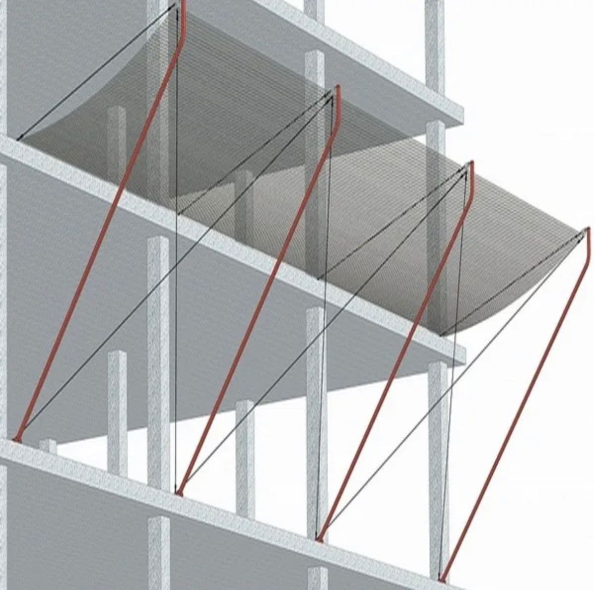 Система крепления состоит из: нижней опоры и набора приспособлений к ней, кронштейна, плетеной полиамидной сетки (ЗУС), шнура, каната для фиксации и верхней опоры. Обеспечивает надежную фиксацию всей конструкции в целом на отвесной стене.